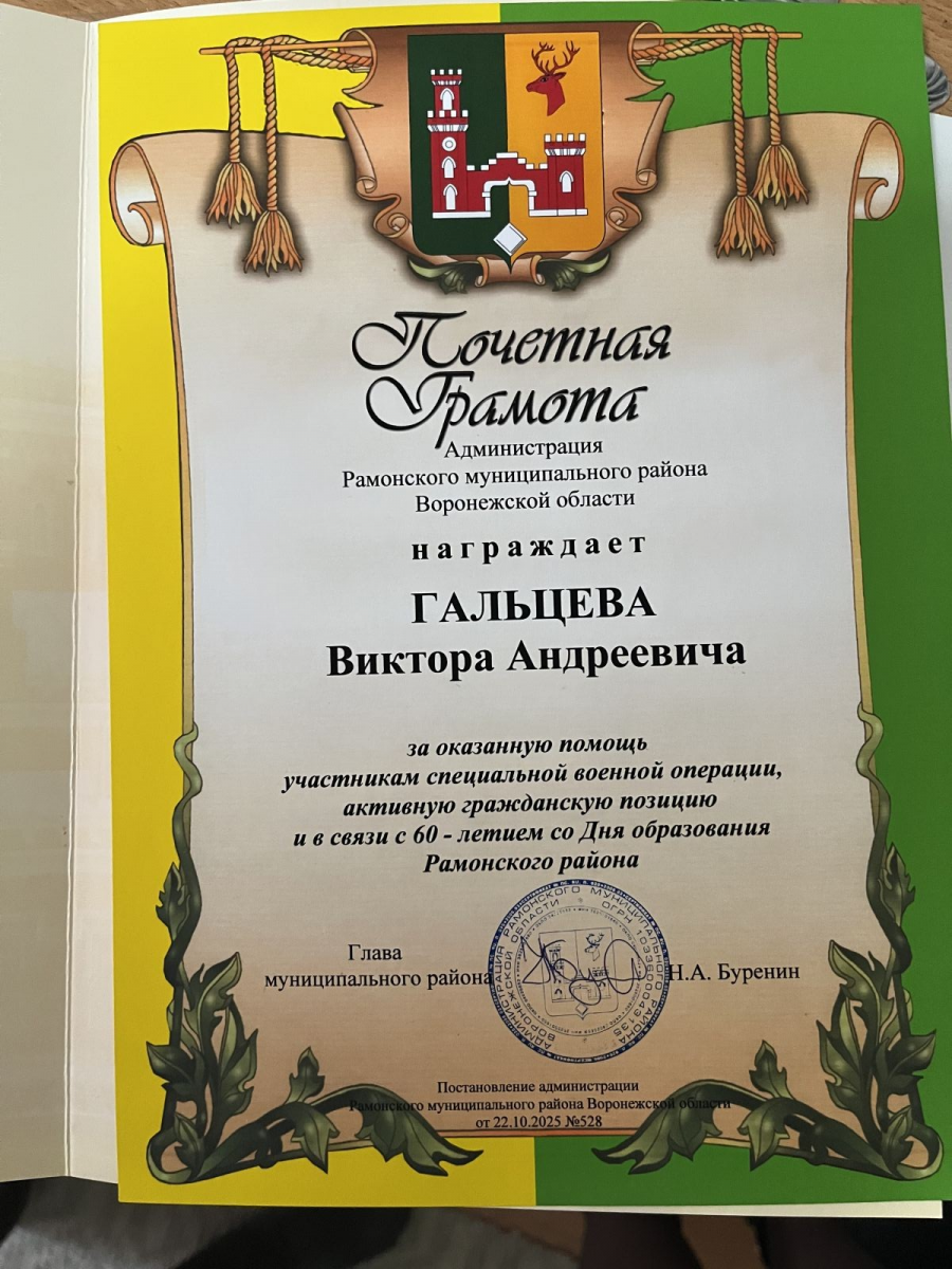 3 ноября 2025 г. Рамонскому району исполнится 60 лет со дня его образования. В канун этой знаменательной для всех рамонцев даты, в районной администрации состоялся торжественный прием. В зале собралось больше сорока представителей самых разных профессий, которые своим трудом и инициативами ежедневно вносят вклад в развитие и благополучие родного района. Среди приглашенных был проживающий нашего учреждения Гальцев Виктор Андреевич, который неоднократно вносил свой вклад в приближение победы в СВО. Глава Рамонского муниципального района Николай Буренин наградил Виктора Андреевича Почетной грамотой за оказанную помощь участникам специальной военной операции, активную гражданскую позицию и в связи с 60-летием со Дня образования Рамонского района.